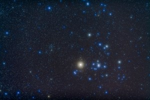 Hyades, and Aldebaran in the face of Taurus the bull, with smaller open cluster NGC 1647 at left. This is a stack of 4 x 4 minutes exposures with Canon 5D MkII camera at ISO 800 and 135mm lens at f/2.8, plus two exposures at the same settings but with Kenko Softon filter in place to add star glows.