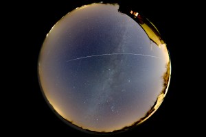 Pass of ISS and STS133 Discovery on its last mission. Feb. 27, 2011. Craft disappear at left as they go into the Earth’s shadow. Travel was from west to east, here from right to left. Notice the pyramid of light in the west from Zodiacal Light in the evening sky. This pass started at 7:41 pm MST. It is a stack of 2 x 4 minute exposure, at f/4 with Sigma 8mm fish-eye lens and Canon 5D MkII at ISO 800. Tracked on AP Mach 1 mount. The sky was slightly hazy. Orion and Canis Major are at the bottom above the southern horizon.