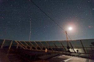 A shot taken from the upper deck of the Nieuw Amsterdam ship in the Carribean, sailing NW toward Florida, and near Turks and Caicos. The waxing Moon is in front the bow, and Orion and Canis Major at left. Latitude was about 20° N. This was a 5 sec exposure at ISO 6400 with Canon 5D MkII and 16-35mm lens at f/2.8.