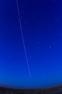This is a stack of thirteen 15-second exposures at f/4 with the Canon 15mm lens and Canon 7D camera at ISO 400. The 1-second intervals between exposures created the gaps in the trail which give a sense of the craft slowing down in its apparent motion as it flies away toward the horizon.