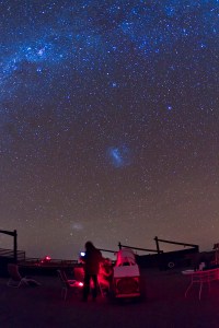 Two observers check the charts and ponder the views of the Large Magellanic Cloud as they explore its many objects. This was taken at the Atacama Lodge, Chile, May 3, 2011. The observers are Philip Downey (standing, with iPan chart) and Gary Finley (seated at the eyepiece of an 18-inch telescope).