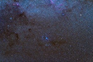 Southern Pleiades (IC 2602) area south of Carina Nebula. Open cluster Mel 101 below IC 2602 and IC 2714 cluster at upper left. Taken from San Pedro de Atacama, Chile, May 2011 with Canon 7D (unmodified) and 135mm Canon telephoto lens at f/2.8 for stack of 5 x 2 minute exposures at ISO 1250.