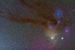 Antares area of Scorpius, with dark lanes of nebulosity (Rho Ophiuchi dark nebulas) leading down to Antares and globular cluster M4 at lower right, with colourful reflection and emission nebulas. Takenf from San Pedro de Atacama, Chile, May 2011, with Canon 7D (unmodified) and Canon 135mm telephoto lens at f/2.8 for stack of 8 x 2 minute exposures at U=ISO 1250.