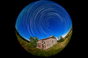 A circumpolar star trail shot, with an old farm shed as the landscape focus. Taken July 14, 2011 at an old farmstead near home in southern Alberta. This is a stack of 660 17-second exposures, 1s apart, taken with the Canon 5D MkII at ISO 800 and 8mm lens at f/4.5, taken over 3.5 hours from 11:15 pm to 2:42 am. Light from Full Moon (off frame at top) illuminated the landscape and made the sky blue. Images stacked the Chris Schur’s Photoshop Action.