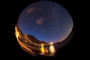 Stars and Milky Way over Waterton Hotel, Waterton Lakes National Park, July 20, 2011. This is one frame of 470+ frames taken for a time-lapse movie over 4 hours. This is a single 30-second exposure at f/4 with the Sigma 8mm lens at Canon 5D MkII at ISO 1600. The Moon is about to rise at right, giving a sky glow to the horizon while some deep blue twilight remains.