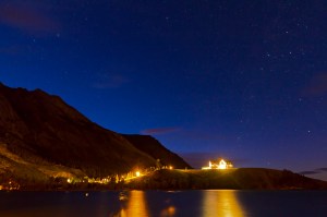 The northern stars over Waterton Hotel, at Waterton Lakes National Park, Alberta, Canada, taken July 20, 2011. This is one frame of 400+ taken for a time-lapse movie sequence. This is a single 33-second exposure at f/5 with the Canon 10-22mm lens at 13mm, and Canon 7D camera at ISO 1250. It was taken with deep twilight still present but before moonrise. Cassiopeia is at right, the Pointer stars of the Big Dipper at left, and Polaris at centre top.