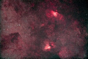 Messier 16 (Eagle Nebula, top) and Messier 17 (Swan or Omega Nebula, bottom), shot from home in southern Alberta with the objects low on the horizon, July 30, 2011. This is a stack of 5 x 5 minute exposures at ISO 1600 with the filter-modified Canon 5D MkII and the Borg 77mm f/4.3 astrograph lens (300mm focal length), and using the IDAS V nebula filter.