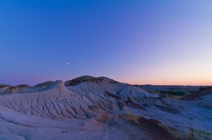 First quarter Moon in evening twilight at Dinosaur Provincial Park, Alberta. Taken August 6, 2011 as part of a 535-frame time-lapse movie. Taken with Canon 7D and 10-22mm lens. This is 1/40th sec at f/5 and ISO 400.