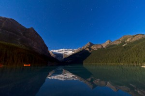 Lake Louise, Banff, Alberta by moonlight, taken August 13, 2011. Taken as part of a 477-frame time lapse movie, taken with the Canon 7D at ISO 800 and 10-22mm lens at f/4 for 30 seconds.