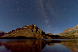 Bow Lake, looking west, Banff National Park, on August 20, 2011. This is a single exposure of 40 seconds at ISO 1000, with the Canon 7D and 10-22mm lens at 10mm and f/4.5. Light is from the last quarter Moon off frame. This is one frame of 454 taken as part of a time-lapse sequence.