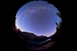 Milky Way over Peyto Lake in Banff, Alberta, Sept. 4, 2011, looking north to the continental divide and the Mistaya Valley. This is one frame of 275 of a time-lapse sequence, taken with the Canon 5D MkII at ISO 2500 and Sigma 8mm lens at f/4.5 for 60 seconds. The quarter Moon is just setting at left over Peyto Glacier.