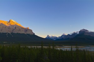 Twilight at Saskatchewan River Crossing, Banff, Alberta, Sept 4, 2011, with the waxing quarter Moon in the southwest sky. Taken from the overlook near the Sask River Resort off the Icefields Parkway. Looking toward the Saskatchewan and Howse Rivers, with Mt. Murchison the prominent peak at left. This is a 6-image High Dynamic Range stack of exposures taken at 2/3rd f-stop intervals, using the Canon 7D at ISO 100 and 10-22mm lens at 16mm and f/8.