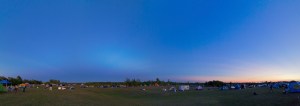Twilight at Starfest 2011, the major star party in southern Ontario. This is a 4-frame panorama of the field and the clear sky at twilight with sunset colours at right and the rising arch of Earth’s shadow at left.