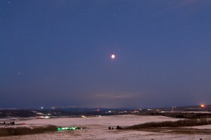 This is the total eclipse of the Moon, December 10, 2011, taken from the grounds of the Rothney Astrophysical Observatory, near Priddis Alberta, and looking west to the Rockies. This is a 30-second tracked exposure at ISO 500 with the Canon 5DMkII and Sigma 50mm lens at f/2.8. Being tracked the stars are points but the ground is trailed slightly. This was taken just before the start of totality. The Pleiades are at right, Betelgeuse is at left. The Moon is in Taurus.