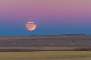 Rising Full Moon on January 8, 2012, with the Moon rising nearly synchronous with the setting Sun for good lighting. Taken with 200mm lens and 1.4x Extender and Canon 7D camera. Pink Belt of Venus twilight glow is prominent here. Some green rim visible on top limb of the Moon and red rim below, and distorted disk of the Moon from refraction. Taken from home in southern Alberta.
