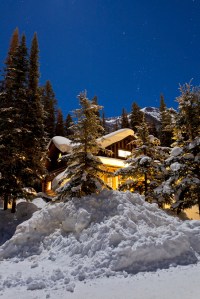A moonlit nightscape shot from February 2012, with a gibbous Moon providing illumination of a scene with Orion over Mount Fairview and the Swiss Guide Chalet at Lake Louise, Alberta. Taken February 4, 2012. This is a 25-second exposure at f/4 and ISO 400 with the Canon 5DMkII and Canon L-series 24mm lens.
