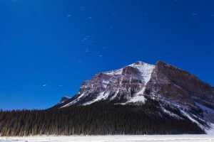 Orion over Mount Fairview at Lake Louise, Alberta on a very clear night on February 4, 2012. This is a long 4-minute exposure to trail the stars, taken at f/4 and ISO 100 with the Canon 5D MkII and Canon L-series 24mm lens.