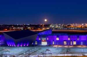 The Full “Snow” Moon rising on February 7, 2012, above the TELUS Spark science centre in Calgary, Alberta, taken from Tom Campbell Hill overlooking the science centre and Deerfoot Trail. Metered exposure, taken with the Canon 7D and 28-135mm Canon lens.