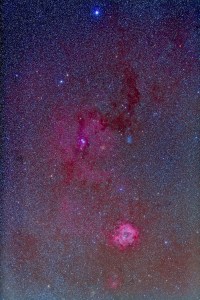 The Rosette Nebula NGC 2237, at bottom, with open clsuter NGC 2244, and complex of nebulosity in Monoceros above, including Cone Nebula and Christmas Tree Cluster, and Monoceros dark nebula complex. This is a stack of 5 x 8 miniute exposures at f/2.8 and ISO 800 with Canon 5D MkII and Canon L-series 135mm lens.