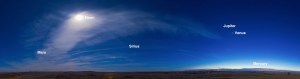 A 5-segment panorama of the evening sky, March 4, 2012, with four planets across the sky, from (right to left, west to east): Mercury (in bright twilight), then Venus and Jupiter (bright in southwest) then the Moon (in clouds in the southeast) then Mars rising in the east just to the left of the clouds. Mercury was near greatest eastern elongation (March 5) and Mars was near opposition (March 3). Each segment is a 13-second exposure at f/4 and ISO 400 with the 16-35mm lens at 19mm and Canon 5D MkII. Taken from near home in southern Alberta.