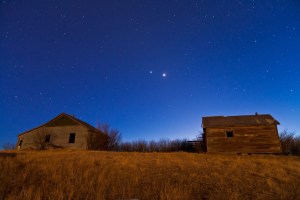 Venus and Jupiter in deep twilight (no moonlight) over old farmstead buildings near home, March 10, 2012. Taken with Canon 5D MkII and 16-35mm lens 24mm and at f/2.8 for 30 seconds at ISO 640. Car headlights illuminated the buildings and foreground.