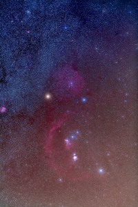 The constellation of Orion the hunter, taken Febraury 17, 2012 from home. This is a 4-image stack of 5-minute exposures with the Canon 5D Mark II at ISO 800 and Sigma 50mm lens at f/3.2. Light haze added the natural glows around stars (no filter employed here). Colour correction applied to reduce sky glow gradient at bottom of frame.