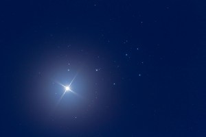 Venus in the Pleiades star cluster, M45, on April 3, 2012. Taken from home on a hazy night with the 92mm TMB apo refractor, and Canon 7D camera for 13 seconds at ISO 200 and f/4.5 with the Borg reducer/flattener. Taken later in darker twilight. Wire taped in front of the lens provided the diffraction spikes. More haze and high cloud had moved in by this time providing more of a glow around Venus than in #1 shot.