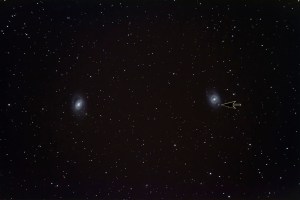 M95 and M96, a pair of barred spiral galaxies in Leo. Taken April 09, 2012, with Supernova SN 2012 aw shining in M95 (at right), as star at 5 oclock in outer spiral arm. This was taken with the 130mm Astro-Physics refractor at f/6 with no field flattener, with the Canon 7D at ISO 800 for a stack of 6 x 8 minute exposure. Processed with ACR 7 and Photoshop CS6 trial.