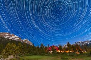 A composite of 233 images, taken with the Canon 5D MkII and 16-35mm lens, at Bow Lake in Banff, showing circumpolar star trails across the sky looking north over Num-Ti-Jah Lodge. Each image was 50 seconds, taken at 1s intervals at ISO 1250 and at f/4. Stacked in Photoshop using Chris Schur’s Photoshop Action.