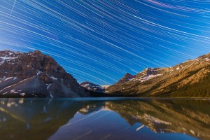 A composite of about 180 images, taken with the Canon 60Da and 10-22mm lens at 10mm, at Bow Lake in Banff, showing star trails across the sky looking west. Illumination is from the waning gibbous Moon over frame to the left Moon. A meteor appears above Bow Peak,; a satellite rises over Bow Glacier. Each image was 45 seconds, taken at 1s intervals at ISO 1600 and at f/4.5. Stacked in Photoshop using Chris Schur’s Photoshop Action.