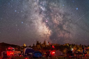 The Sagittarius Milky Way area, around the centre of the Galaxy, over the trees and campsite at Cypress Hills Interprovincial Park, Sasksatchewan. Taken August 17, 2012 at the Saskatchewan Summer Star Party. This is a composite of 6 exposures: all 2 minutes at f/2.8 and ISO 1600 with the Canon 5D MkII and Sigma 50mm lens, but 5 exposures were tracked and 1 exposure was untracked to prevent the ground from blurring. Ground is from the untracked exposure, sky is from the stack of 5 tracked exposures. All taken from the same location — the ground is not faked onto a separate sky shot. The horizon is in its true location.