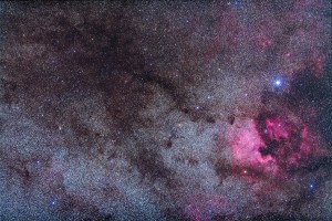 The area of northern Cygnus, showing the dark nebula known as LeGentil 3 north of Cygnus in the Milky Way, along with the bright emission nebulas of the North America Nebula and the Pelican Nebula near Deneb. This is a stack of ten 5-minute exposures at f/2.8 with the 135mm Canon L-series telephoto and filter-modified Canon 5D MkII camera at ISO 1600, tracked on the Kenko SkyMemo tracker with no guiding. Taken at the Saskatchewan Summer Star Party, August 16, 2012.