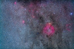 The IC 1396 nebula area of southern Cepheus, along with other faint nebulas such as Sharpless 2-129 at far right, and NGC 7380 at top left. Opaque dark nebula above centre is the B169-170-171 complex. Dark nebula below IC1396 is B160. Orange star on top edge iof IC 1396 is Mu Cephei, the Garnet Star. This is a stack of five x 5 minute exposures at f/2.8 and ISO 1600 with the Canon L-series 135mm telephoto lens, and Canon 5D MkII. Taken from Cypress Hills as the Saskatchewan Summer Star Party, August 2012.