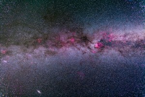 The northern Milky Way from Cygnus at right to Cassiopeia and northern Perseus at left, with boosted contrast to bring out faint nebulosity. Taken from Cypress Hills at the Saskatchewan Summer Star Party, August 18, 2012. Taken with the Canon L-series 24mm lens at f/2.8 and Canon 5D MkII (modified) for a stack of 5 x 5 minute exposures at ISO 800.