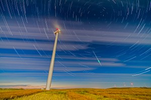 A stack of 434 exposures, taken for a time-lapse sequence, each exposure being 5 seconds at f/4 and with the Canon 7D at ISO 2000 and 10-22mm lens at f4. Exposures were short due to bright full Moon light and to minimize blurring of the windmill blades. A bright meteor appeared on one of the frames. The windmill is in the Wintering Hills windfarm south of Drumheller, Alberta.