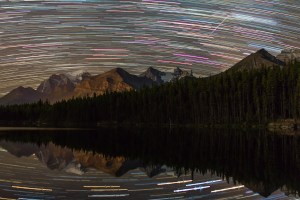 A composite of 35 exposures, each 45 seconds at f/2 with the Canon 7D at ISO 640 and 24mm lens taken before moonrise, plus one 45 second exposure taken after moonrise, of just the landscape (sky and reflected sky masked out) added to the foreground to brighten mountains in the moonlight.