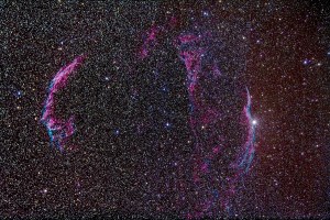The Veil Nebula in Cygnus, a supernova remnant. Includes NGC 6960 (at right), NGC 6992-5 (at left) and the central NGC 6974 and NGC 6979 components. This is a stack of 5 x 15 minute exposures with the Canon 5D MkII at ISO 800 with the Lunt 80mm f/7 doublet apo refractor and Borg 0.85x field flattener/reducer. Taken as part of testing.