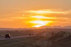 Sunset on the eve of the Autumnal Equinox, Sept 21, 2012, with the Sun setting due west at the end of westbound Highway 1 to Banff, Alberta. This is a frame from a 315-frame time-lapse movie.