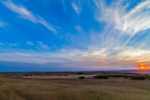 This is sunset on the evening of the Autumnal Equinox, Sept 22, 2012, with a first quarter Moon in the sky. The image illustrates the geometry of the quarter Moon’s position, which is always 90° away from the Sun. In this case, because the Sun was on the equinox position on the ecliptic, it was setting due west this night, putting the quarter Moon due south at sunset. Draw a line from the Moon to your eye (the camera) and then out to the Sun and it forms a 90° right angle. This was taken from the grounds of the Rothney Astrophysical Observatory on the occasion of their monthly Open House.