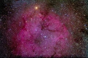 IC 1396, large emission nebula in Cepheus, with the red Garnet Star (mu Cephei) at its north edge at top of frame. This is a stack of 7 x 15 minute exposures at ISO 800 with the Canon 5D MkII and Lunt 80mm f/7 doublet apo refractor with Borg 0.85x field flattener and reducer.