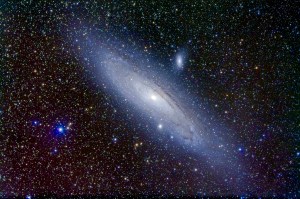 Andromeda Galaxy, M31, with the Lunt 80mm f/7 doublet apo refractor for stack of 5 x 15 minute exposures at ISO 800 with Canon 5D MkII and Borg 0.85x flattener/reducer. Companion galxies, M31 and M110 also shown. Taken from home. Field is roughly 4 x 2.5°.