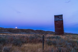 The old grain elevator at Dorothy, Alberta and the Full Harvest Moon, Sept 29, 2012. Shows the Belt of Venus pink glow above the blue shadow of the Earth. Taken as part of a 400-frame time-lapse sequence. With Canon 5D MkII and 16-35mm lens. Exposure with Little Bramper intervalometer.