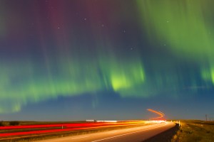 Aurora over Highway 1, the Trans-Canada Highway, west of Brooks, Alberta, on Sept 30, 2012. This is looking north to the Big Dipper. This is a composite of two 10-second exposures at ISO 400 with the Canon 7D and 24mm lens at f/2.8. A second exposure layered in adds in additional trails from the tailights, but the sky is from a sinngle exposure.