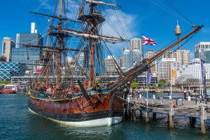 The replica of Captain Cook’s first expedition ship, the HMB Endeavour, in dock at the National Maritime Museum; Sydney, Australia, at Darling Harbour. Taken Oct 30, 2012.