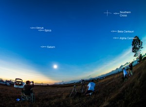 A cropped version of one of the wide-angle shots of the November 14, 2012 total eclipse of the Sun, marking the locations of the brighter planets and stars visible in the sky at eclipse time.