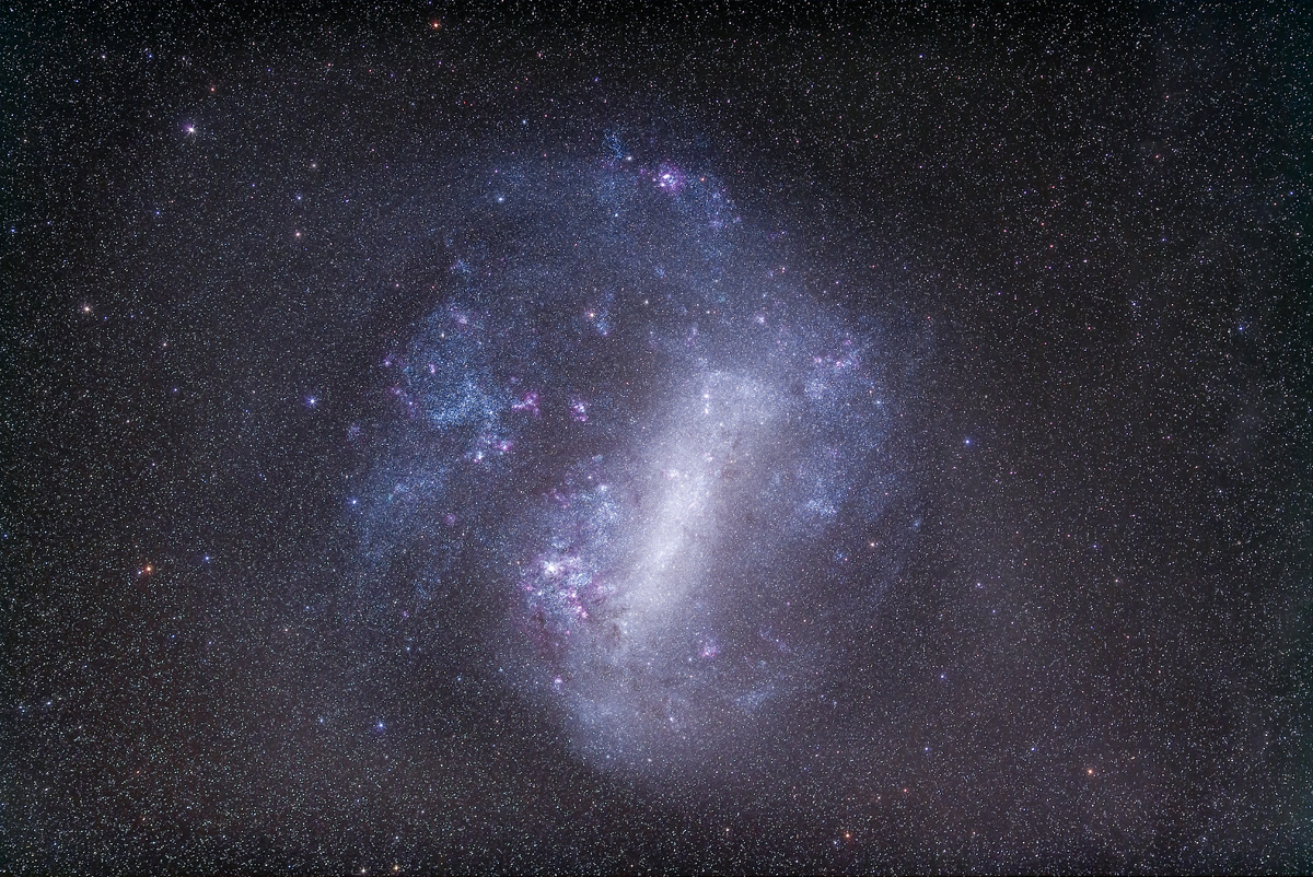 The LMC, Large Magellanic Cloud, taken with 135mm telephoto lens for a field of view similar to binoculars. Taken from Timor Cottage, Coonabarabran, NSW, Australia, Dec 5, 2012. This is a stack of 10 x 5 minute exposures, median combined (to eliminate some satellite trails) at f/2.8 with Canon L-series 135mm lens and the modified Canon 5D Mark II camera at ISO 800. Tracked on AP 400 equatorial mount.