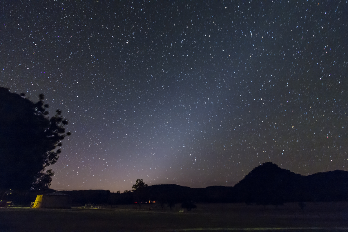 The evening Zodiacal Light as seen in spring (December) in the southern hemispher — taken Dec 6, 2012 from Coonabarabran, NSW, Australia. This is an 80 second untracked exposure at f/3.5 and ISO 1600 with the Canon 60Da and 10-22mm lens.