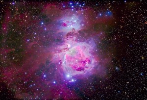 The Orion Nebula complex consisting of M42, M43 and the reflection nebula area known as the Running Man Nebula, NGC 1973-5-7. NGC 1981 is the blue star cluster at top north edge. North is up, though in the sky from Australia where this was shot the object appeared upside down compared to this northern-centric view.