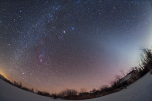 The Zodiacal Light in the evening western sky, from the northern hemisphere, on a snowy February evening under very clear skies. Taken from home in rural Alberta, with the Canon 15mm lens and Canon 5D MkII camera at ISO 800 for a stack of 4 x 4 minute exposures at f/3.5, though the ground is from just one exposure.