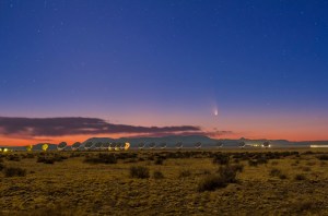 Comet PANSTARRS (C/2011 L4) over the VLA radio telescope array in New Mexico, March 17, 2013. The landscape is lit by the nearly quarter Moon high in the sky out of frame. This is a composite of two images taken moments apart: a 50-second untracked exposure for the ground and a 25-second tracked exposure for the sky, so both sky and ground are sharp. All at f/2.8 with the 50mm Sigma lens on the Canon 60Da at ISO 400. Position worked out with Photographers Ephemeris.